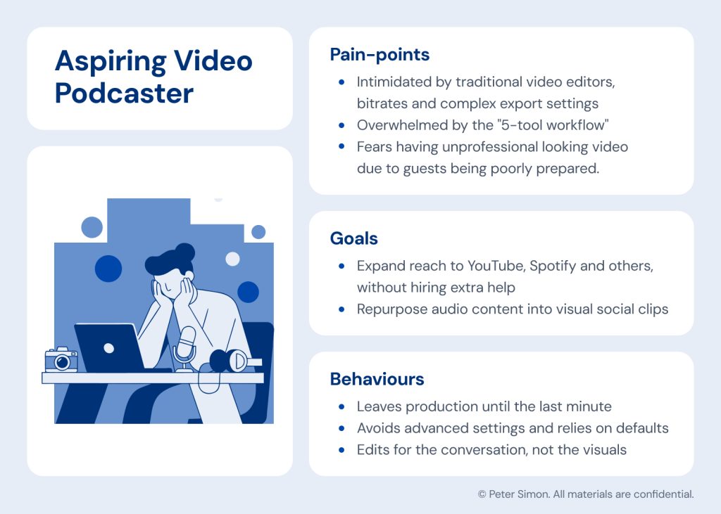 | Podcasters wanted to get into video but found the prospect overwhelming (they didn’t know what to do to get video ‘right’ and needed guidance on how to create a video show) | Platforms like Spotify and Apple started announcing that they would spotlight video shows and there was an opportunity to get more viewers for a podcaster that way | Build on great audio editing features so that switching to video podcasting feels seamless. Reduce decision fatigue and provide smart defaults to improve learnability |